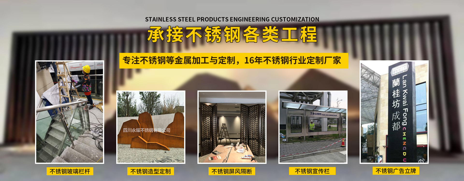四川永耀不銹鋼有限公司是一家集開(kāi)發(fā)、設(shè)計(jì)、加工、制作、安裝、并承接各種不銹鋼工程為一體的綜合性企業(yè)。多年來(lái)一直在專(zhuān)注于不銹鋼等金屬的加工與研發(fā)。在客戶(hù)群體中贏得了良好的聲譽(yù),以專(zhuān)業(yè)專(zhuān)注的精神,致辭力于打造良好的產(chǎn)品和企業(yè)形象,對(duì)每一產(chǎn)品傾注全力,力爭(zhēng)每個(gè)細(xì)節(jié)精細(xì),確保產(chǎn)品具有優(yōu)越的性能,優(yōu)美的外觀及優(yōu)良的品質(zhì),使公司產(chǎn)品深受廣大用戶(hù)的親睞。 本公司主要業(yè)務(wù): 一、工程類(lèi) 承攬:酒店、銀行、商鋪、寫(xiě)字樓、公寓、城鐵、地鐵、公交、機(jī)關(guān)、 學(xué)校、廣場(chǎng)藝術(shù)雕塑、自動(dòng)門(mén)、旋轉(zhuǎn)門(mén)、廣告欄、公